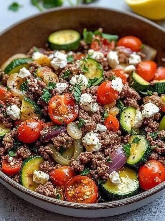 Mediterranean Ground Beef Skillet Ingredients 500g ground beef 1 medium zucchini, sliced into half-moons 1 ...