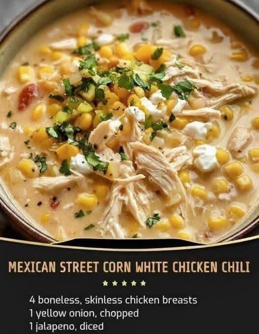 Mexican Street Corn White Chicken Chili Ingredients: 4 boneless, skinless chicken breasts 1 yellow onion, ...