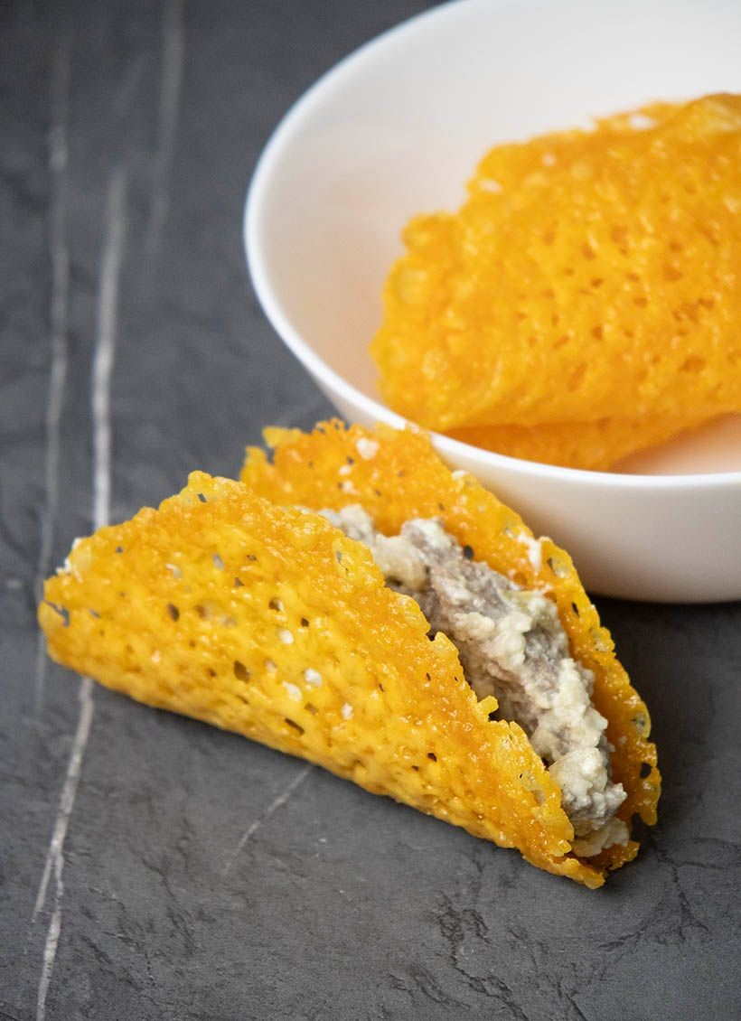 Remove from oven quickly and let cool for 10-15 seconds until pliable but still warm. Carefully lift each cheese round with a spatula and drape over an inverted small bowl, rolling pin, or the bars of a cooling rack to shape taco shells.