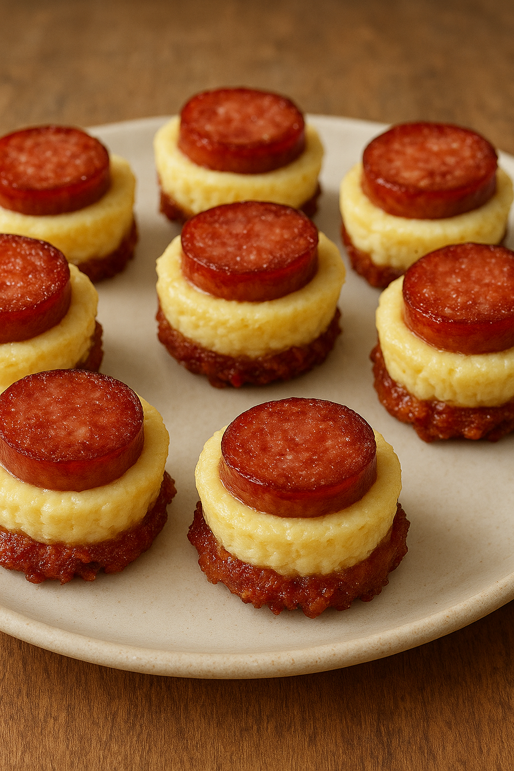 Once chilled, top each cheesecake bite with a slice of sausage or pepperoni.