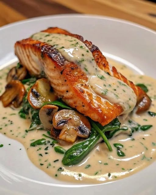 A rich, velvety salmon dish cooked in a luscious garlic–butter cream sauce with tender mushrooms and fresh spinach. Perfect for a quick, gourmet-style dinner that feels indulgent but comes together in under 25 minutes.