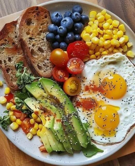 A vibrant, balanced breakfast featuring perfectly fried eggs, creamy avocado slices, sweet corn, juicy cherry tomatoes, fresh blueberries, and whole-grain toast. This meal provides a beautiful mix of protein, healthy fats, fiber, vitamins, and antioxidants — ideal for an energetic and wholesome start to your day.