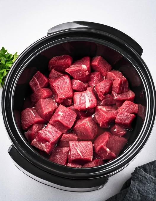 Place the raw cubed beef into the slow cooker (like in your image). -