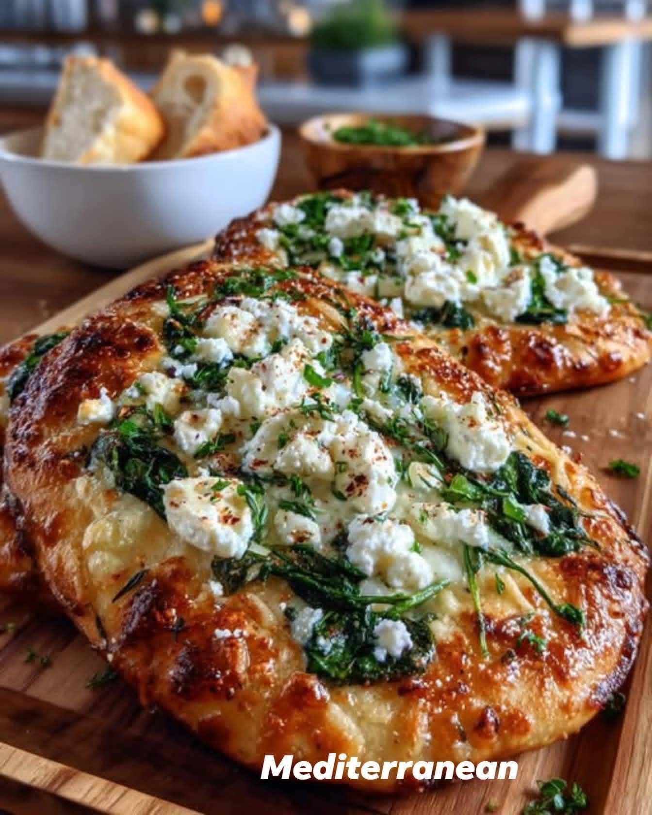 Spread spinach mixture evenly over the flatbreads. Sprinkle with feta, mozzarella, black pepper, and red pepper flakes if using.